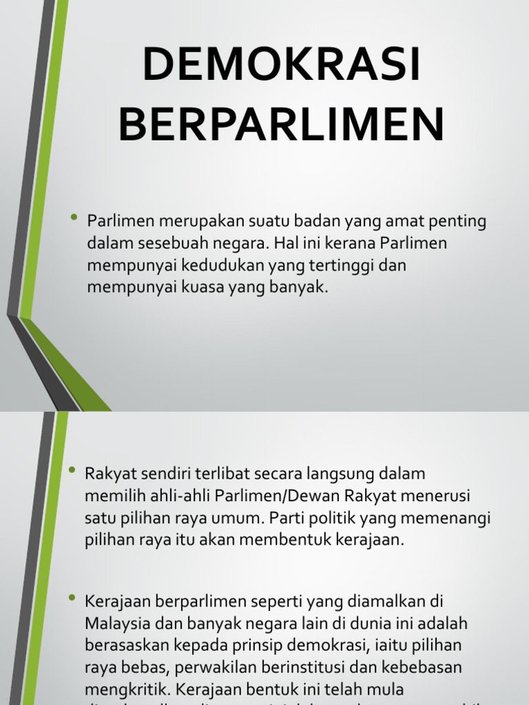 Malaysia pula mengamalkan sistem pemerintahan Demokrasi Berparlimen dan Raja Berperlembagaan sejak mencapai kemerdekaan tahun 1957. Sistem Demokrasi Berparlimen di bawah pentadbiran Raja Berperlembagaan dengan maksud Seri Paduka Baginda Yang Di-Pertuan Agong sebagai Ketua Negara. Demokrasi Berparlimen Sistem pentadbiran kerajaan moden yang mengutamakan mandat dan suara rakyat dalam pemerintahan Mandat daripada rakyat ini diterjemahkan k SlideShare uses cookies to improve functionality and performance and to provide you with relevant advertising.